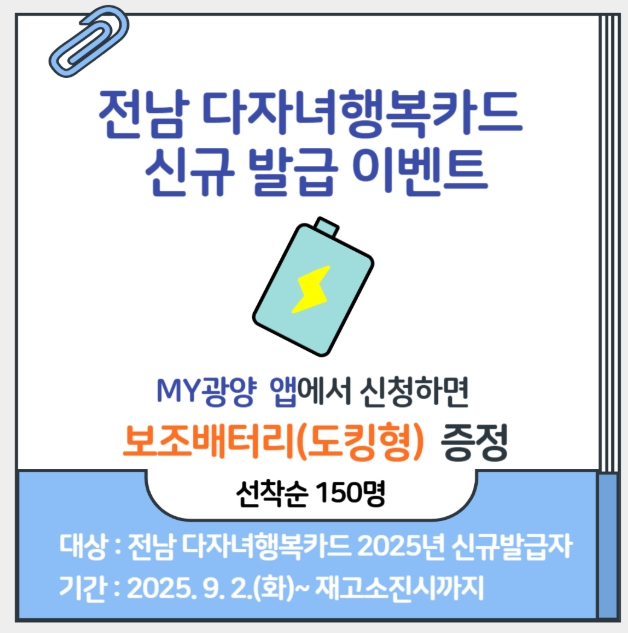 이번 이벤트는 2025년 전남 다자녀행복카드를 새로 발급받은 가정을 대상으로 하며, 9월 2일부터 MY광양 앱을 통해 참여한 선착순 150명에게 보조배터리를 증정한다.