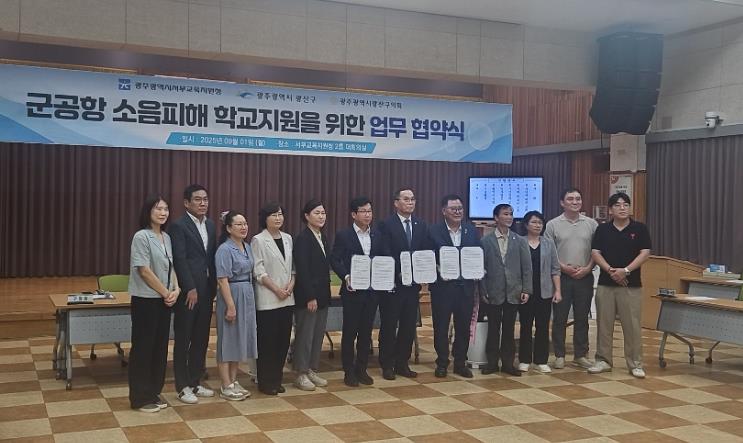 서부교육지원청은 지난 1일 대회의실에서 이성철 교육장, 박병규 광산구청장, 김명수 광산구의회 의장 등이 참석한 가운데 ‘군공항 소음피해 학교지원 업무협약’을 체결했다.