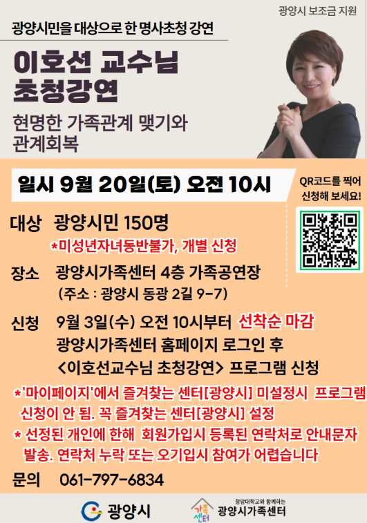 ![]() “이호선 교수, 광양시민과 만난다” 광양시가족센터, 명사 초청 강연 |