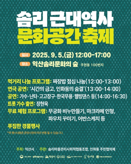 익산시는 오는 5일 정오부터 오후 4시 30분까지 솜리문화의 숲에서 '솜리 근대역사 문화공간 축제'가 열린다고 3일 밝혔다.