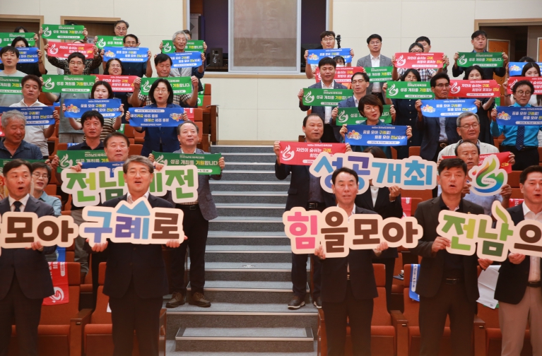 특히, 마지막에 진행된 ‘성공 개최 퍼포먼스’에서는 참석자 전원이 타월을 들고“힘을 모아 구례로, 힘을 모아 전남으로”라는 구호를 외치며 하나 된 마음으로 대회의 성공을 기원했다.