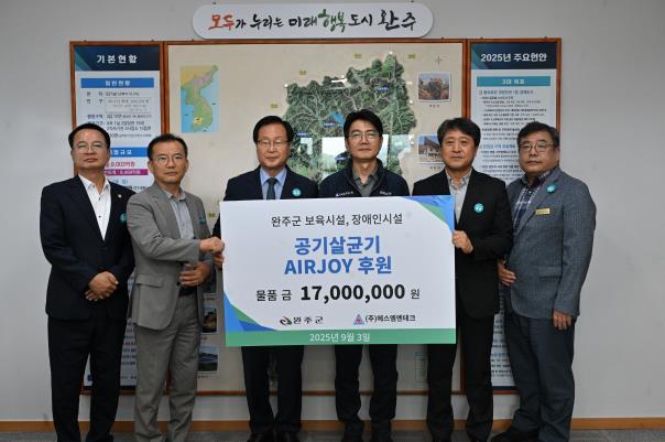 이날 전달식에는 김재천 부의장을 비롯해 유희태 완주군수, ㈜에스엠엔테크 이중수 대표, 선덕보육원 성제환 시설장, 다애공동체 송기준 시설장 등이 함께했으며, ㈜에스엠엔테크는 완주군 관내 보육시설과 장애인시설에 공기정화살균기 ‘에어조이(Airjoy)’ 20대(1,700만 원 상당)를 후원했다.