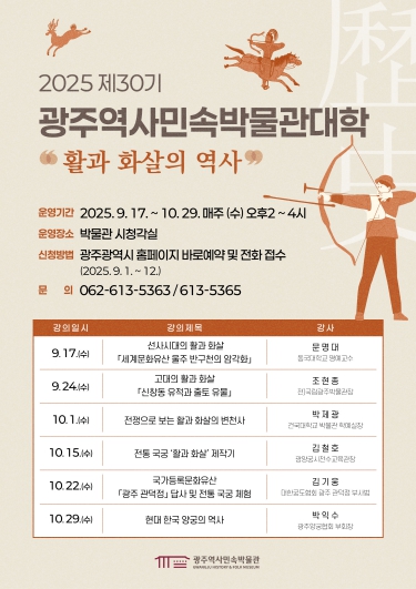 임찬혁 역사민속박물관장은 “이번 박물관대학은 기획전과 연계해 활과 화살의 기원을 폭넓게 이해할 수 있는 기회”라며 “시민들이 사냥·전쟁·스포츠·예술 등 다양한 분야에서 변화해 온 활과 화살의 의미를 깊이 알 수 있을 것으로 기대한다”고 말했다.