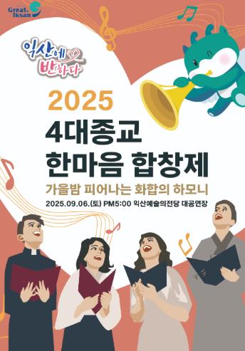 익산시 관계자는 "우리 시의 자랑인 4대 종교가 교류와 화합을 이어가는 이번 행사가 종교를 넘어 지역사회의 조화와 평화를 상징하는 무대가 되길 바란다"며 "합창제를 계기로 상시적인 교류와 화합을 나눌 수 있는 자리가 많아지길 바란다"고 밝혔다.