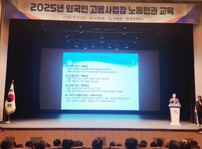 이번 교육은 코리아노무법인 신인철 노무사를 초빙하여 ▲근로자의 기본권 이해 ▲사업장에서의 인권침해 예방 ▲문화적 차이에 대한 존중과 배려 등을 주제로 구성됐으며 무안경찰서의 기초질서 및 인권 보호 캠페인도 함께 진행됐다.