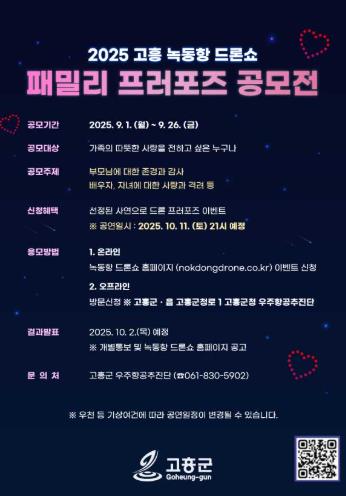 군 우주항공추진단 관계자는 “드론쇼는 단순한 볼거리를 넘어 군민과 관람객이 함께 만들어 가는 참여형 문화콘텐츠로 자리매김하고 있다”며 “이번 공모전을 통해 가족의 소중함을 되새기는 계기가 되기를 바란다”고 말했다.
