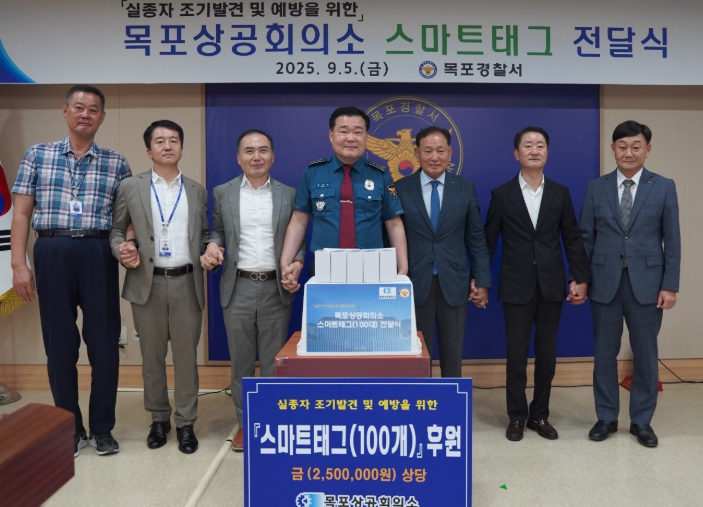 이날 전달식은 목포상공회의소가 목포경찰서에 스마트태그 100개(250만원 상당)를 기증한 것으로 스마트태그는 블루투스를 기반으로 한 소형 위치추적기로써 보호자와 경찰이 실종자의 실시간 위치를 확인할 수 있어 치매노인 등 실종자 조기 발견 및 예방에 많은 도움이 되고 있다.