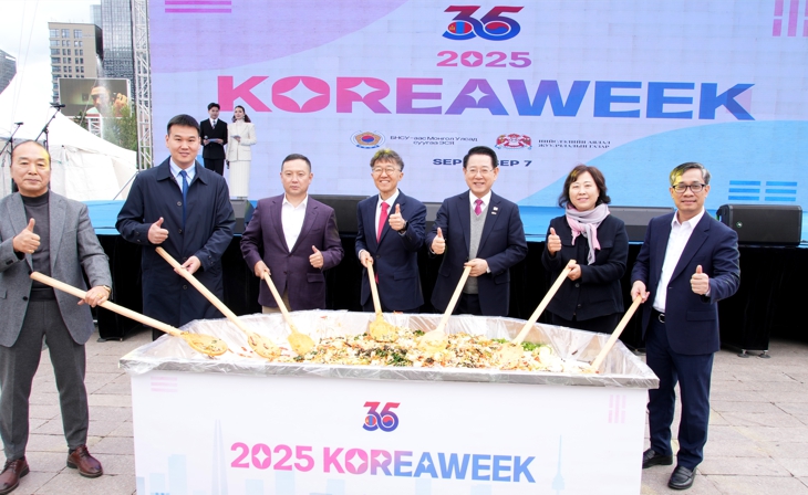 ![]() 몽골을 방문 중인 김영록 전라남도지사가 6일(현지 시간) 울란바토르에서 열린 2025 한국주간(Korea Week)행사 개막식에서 주요 내·외빈들과 한국 음식인 대형 비빔밥을 비비는 퍼포먼스를 하고 있다. |