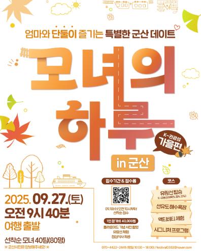 참가비는 1인당 40,000원으로 프로그램 참여는 군산시 공식 사회관계망(SNS) 계정(인스타그램), 군산 K-관광섬 계정(인스타그램) ‘모녀의하루 in 군산 K-관광섬(가을편)’ 게시글 내 QR 부호(코드)를 통해 신청할 수 있다.