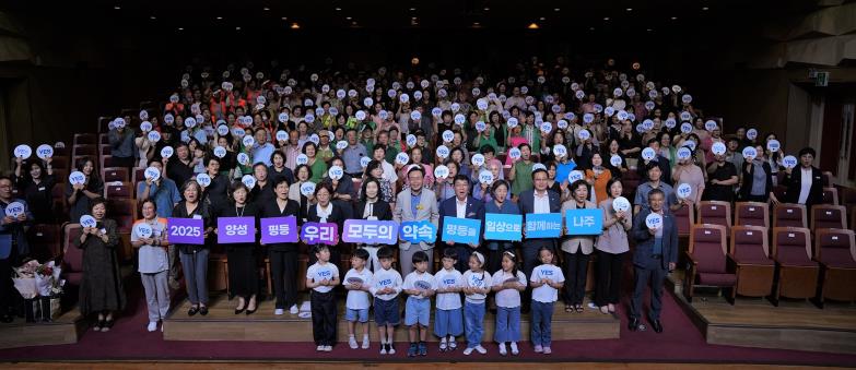 ![]() 나주문화예술회관에서 열린 ‘2025 양성평등주간 기념행사’에 참석한 시민과 관계자들이 단체 퍼포먼스를 하고 있다. |