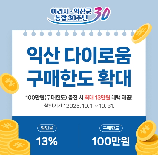 정헌율 익산시장은 "이리·익산 통합 30주년을 시민과 함께 축하하고자 '다이로움 한도 확대'라는 특별한 선물을 마련했다"며 "10월 한 달간 익산 전역이 하나의 큰 축제장이 돼 시민과 소상공인 모두가 웃을 수 있는 계기가 되길 바란다"고 말했다.