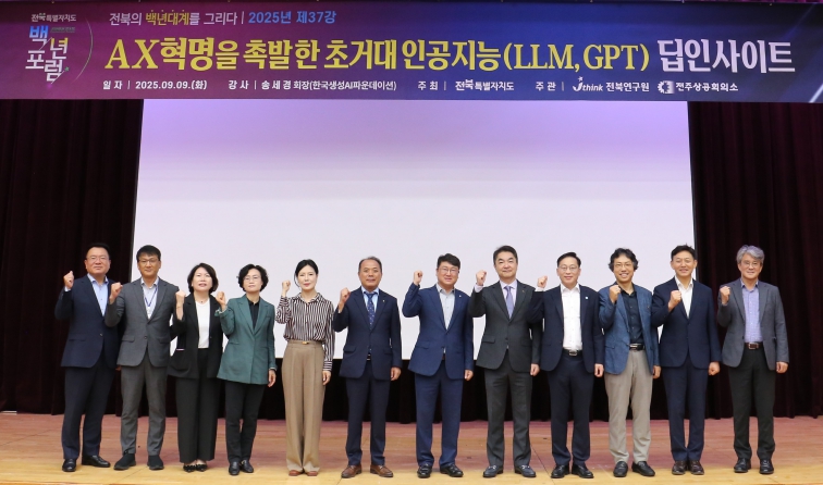 전북연구원은 9일 오전 8시 전북특별자치도청 에서'전북 백년포럼' 제37강을 개최했다. 이번 강연에는 송세경 한국생성AI파운데이션(Koreal Gen AI Foundation; KGAF) 회장이 연사로 나서, ‘AX 혁명을 촉발한 초거대 인공지능(LLM, GPT) 딥인사이트’를 주제로 강연을 펼쳤다.