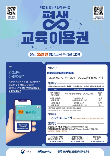 ![]() (포스터)[타기관]전북특별자치도, 평생교육이용권(바우처) 2차 추가 모집…도민 335명 지원 |