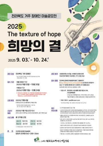 ![]() (포스터)장애인미술협회, '2025 희망의 결' 장애인 미술 공모전 개최 |
