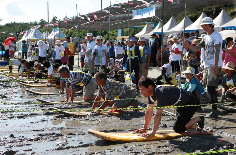 ![]() 보성군, “뻘에서 놀자!” 2025 보성벌교 갯뻘축제 개최_뻘배대회 참가자들이 뻘배대회를 하고 있다(2024). |