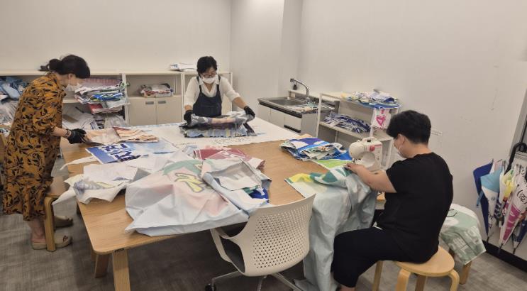 옥주골 창작소는 지난 6월에 진도군 옥외광고협회와 연계해 폐현수막을 수거했고, 7월에는 세척과 건조 등 전처리 과정을 거친 폐현수막을 활용하여 디자인 작업 후 대형 마대, 줍줍 주머니, 화폭(캔버스) 등을 제작했다.