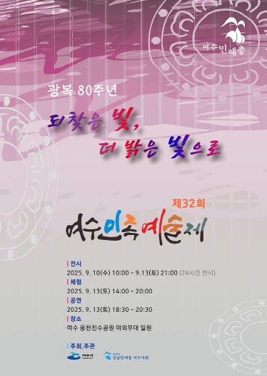 김칠선 여수지회장은 “진보적 예술정신을 바탕으로 지역 문화분권과 문화민주주의 발전을 위해 노력해 온 32년의 전통이 이번 축제를 통해 더욱 빛을 발하길 바란다”며 “특히 광복 80주년을 맞아 ‘되찾은 빛, 더 밝은 빛으로’라는 주제로 열리는 이번 예술제가 시민 모두에게 의미 있는 시간이 되기를 기대한다”고 말했다.