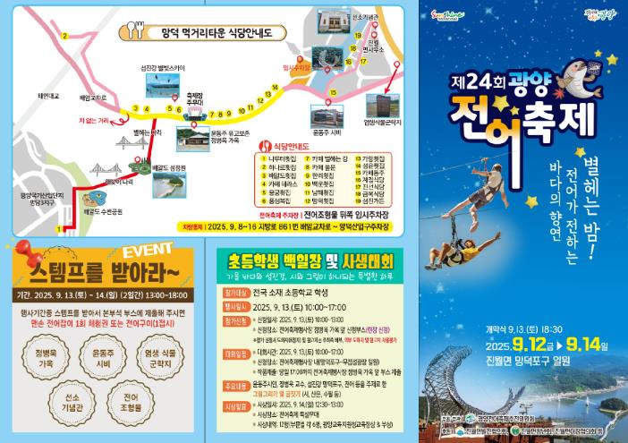 한편, 대한민국 가을 축제의 대명사인 제24회 광양전어축제는 진월 전어잡이소리 시연, 맨손전어잡기 및 전어구이체험 등 축제의 정체성을 살린 프로그램이 풍성하다.