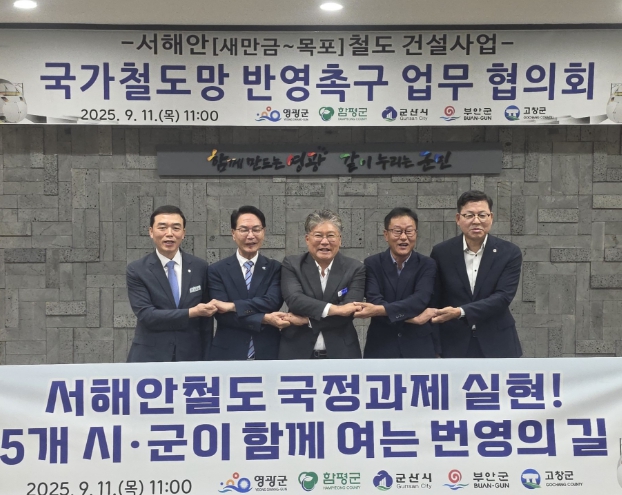 12일 함평군에 따르면 전남 함평군·영광군, 전북 군산시· 부안군·고창군 등 서해안 5개 시군이 함께 지난 11일 ‘서해안철도 국가철도망 반영촉구 업무 협의회’를 개최하고 국가철도망 구축계획 반영과 조기 건설을 위해 공동 대응하기로 했다.