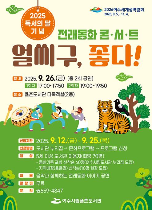 이번 공연은 ‘2025년 여수시립도서관 독서의 달 행사’의 일환으로 마련됐으며 음악과 함께 전래동화를 들려주는 무대로 꾸며진다.