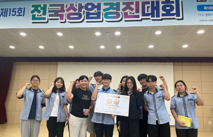 ![]() ‘제15회 전국상업경진대회’에서 비즈니스영어 부문 금상을 수상한 한국항만물류고등학교 학생들이 기념사진 촬영을 하고 있다. |