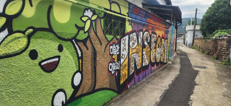 이어 청년 작가들의 발칙한 상상력이 뿜어낸 벽화 헤르매실, 스타벅수 등과 매돌이, 동백 등 광양의 상징물들이 담장의 질감을 그대로 살린 두터운 마티에르로 표현됐다.