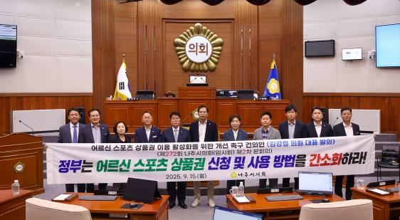 ![]() 나주시의회, 어르신 스포츠 상품권 이용 활성화를 위한 개선 촉구 건의안‘ 채택 |