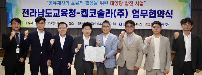 ![]() 전남교육청과 켑코솔라㈜ 관계자들이 15일 전남교육청 비즈니스실에서 ‘공유재산 태양광 발전사업’ 업무협약을 맺은 뒤, 기념사진 촬영하고 있다. |