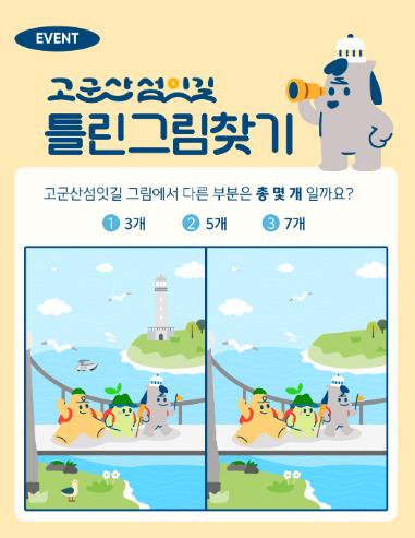 참여 방법은 ①고군산섬잇길의 아름다운 풍경과 캐릭터들이 등장하는 2개의 그림 가운데 틀린 부분의 개수를 센다 ②댓글을 남긴다 ③해당 게시글에 ‘좋아요’를 누르고 공식 계정을 팔로우하면 된다.