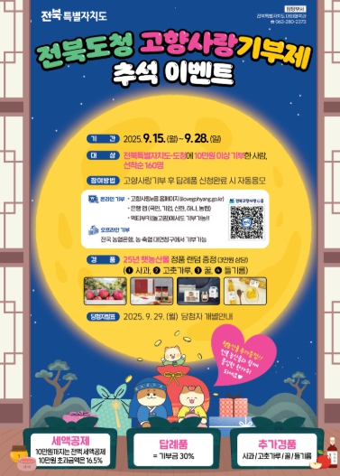 ![]() 전북자치도, ‘고향사랑기부제 추석이벤트’진행 |