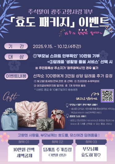 광주광역시는 오는 10월12일까지 고향사랑기부제 참여를 독려하고 부모님 돌봄서비스 이용을 장려하기 위해 ‘추석맞이 효도패키지 이벤트’를 진행한다.