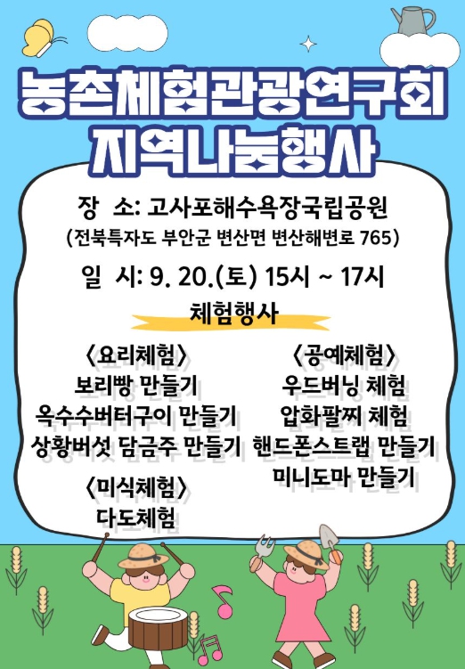 행사를 주최하는 채명심 회장은 “지역 사회에 봉사하고 부안 농촌의 매력을 알리고자 이번 행사를 기획했다.”며, “많은 분이 오셔서 가을 바다의 정취와 함께 농촌 체험의 즐거움을 만끽하시길 바란다”고 전했다.