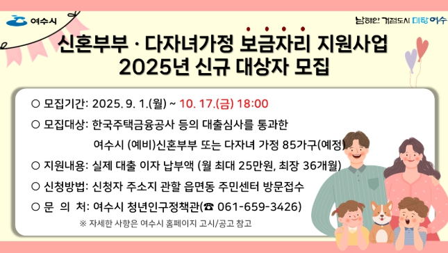 신청 자격은 여수시에 거주하는 무주택 신혼부부(혼인 7년 이내, 부부 모두 만 49세 이하) 또는 다자녀가정(미성년 자녀 2명 이상, 그중 1명은 만 12세 이하)이다.