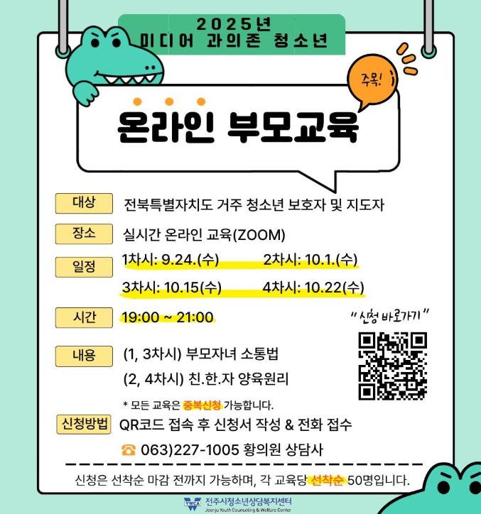 정혜선 전주시청소년상담복지센터장은 “온라인 부모 교육을 통해 우리 자녀들의 미디어 사용 습관을 점검하고, 부모-자녀 간 관계 개선을 통해 가족 간 소통이 원활해지는 계기가 되길 바란다”고 말했다.