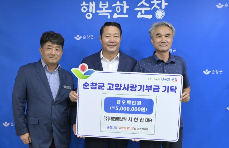 최영일 순창군수는“올해까지 벌써 3년째 변함없는 모습으로 고향에 대한 애정을 기부로 실천해 주신 서한집 대표께 진심으로 감사드린다”면서“고향발전을 응원하는 마음에 보답할 수 있도록 보내주신 기부금을 소중히 활용하겠다”고 화답했다.