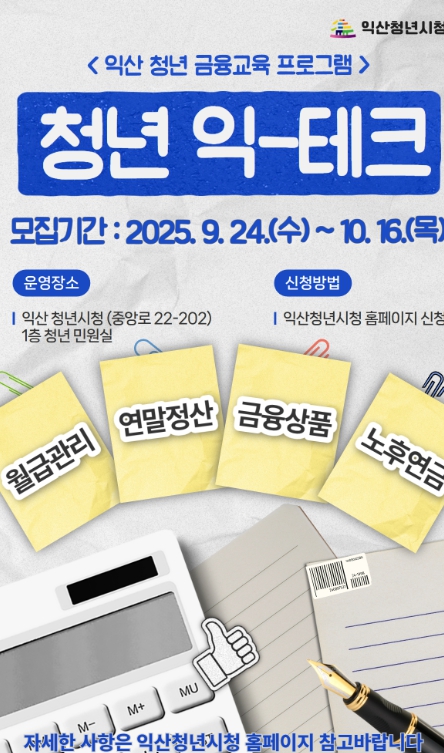 정헌율 익산시장은 "청년 익테크는 단순한 금융 지식 전달을 넘어 청년들이 스스로 경제적 자립을 설계할 수 있도록 돕는 실질적인 교육 프로그램"이라며 "많은 청년이 참여해 안정적인 자립 기반을 다지길 바란다"고 말했다.