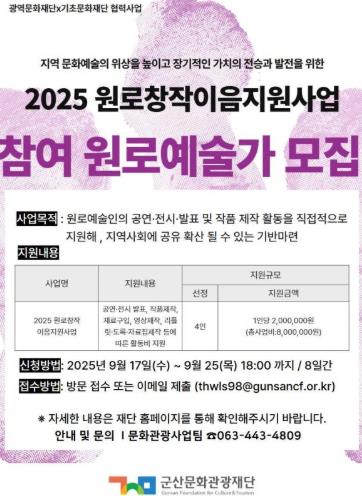 ![]() 군산문화관광재단 2025 원로창작이음지원사업 참여 원로예술인 모집 |