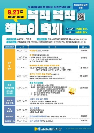이번 축제는 9월 독서의 달과 연계해 진행되는 가을 독서 문화 행사로, 도서관에 대한 이해와 관심을 높이고 이용을 촉진하기 위해 김제시공립작은도서관 연합회, 어린이도서연구회, 어린이집, 학교 등 지역사회와 함께 다양한 프로그램을 운영한다.