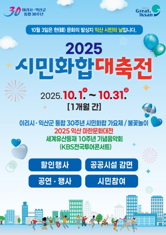 익산시 공식 SNS를 통해 진행되는 '통합 30주년 퀴즈 이벤트'는 10월 한 달간 매일 문제를 내고, 정답자에게는 소정의 기념품이 제공된다.