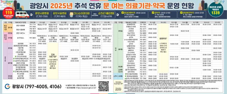 ![]() 광양시, 추석 연휴 응급환자 발생 대비 비상진료체계 마련 - 보건행정과(의료기관 약국 운영 현황-가로형) |
