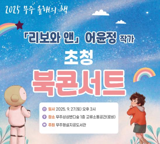 어윤정 작가는 2025 무주 올해의 책(어린이 분야)으로 선정된 “리보와 앤” 집필 작가로, 이날 콘서트에서는 작가와 만나 작품에 얽힌 다양한 이야기를 나눌 예정이다.
