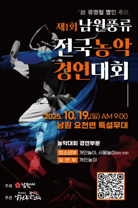 최경식 남원시장은 “남원풍류 전국농악경연대회가 전통 농악을 계승하고 청소년부터 성인까지 모두가 참여하는 문화축제로 자리매김할 것”이라며 “농악의 본향 남원이 문화적 위상을 더욱 공고히 할 수 있도록 다양한 지원을 이어가겠다”고 밝혔다.