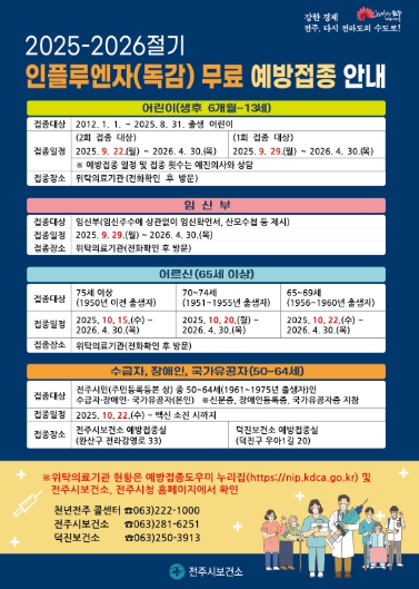 2025-2026 절기 독감 무료 접종 대상자는 △생후 6개월~13세 어린이 및 임신부 △65세 이상 어르신 △50~64세 전주시 취약계층(기초생활수급자와 장애인, 유공자)이다.