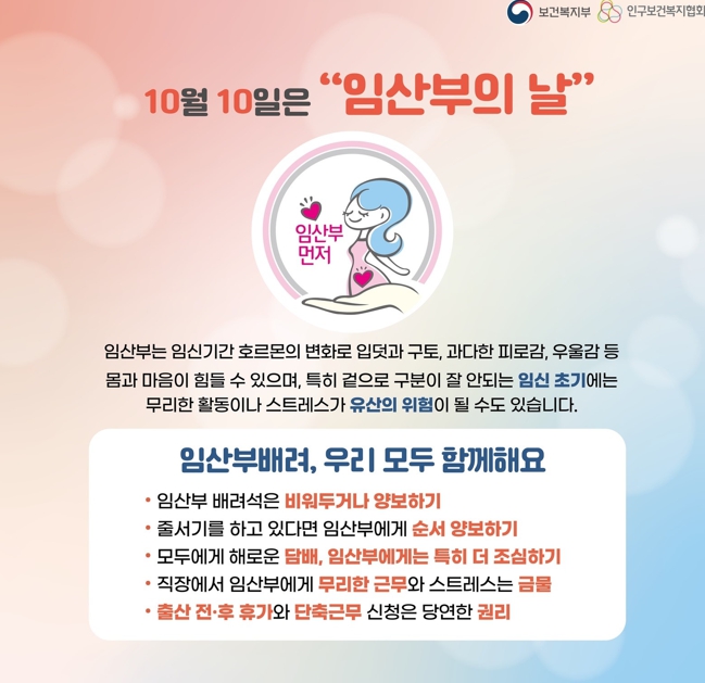 올해로 제20회를 맞는 임산부의 날은 ‘모자보건법’에 따라 제정된 법정 기념일로 풍요와 수확을 상징하는 10월과 임신기간 10개월을 의미하는 10월 10일이다. 임산부의 날은 임신과 출산이 사회적으로 존중받고 양육의 어려움을 함께 해결해야 한다는 사회적 메시지를 담고 있다.