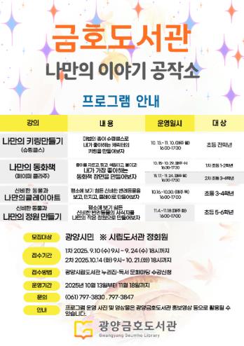 ![]() 광양금호도서관, '나만의 이야기 공작소' 프로그램 수강생 모집 |