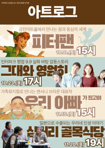 오는 10월 11일 ‘피터팬’을 시작으로 이어지는 ‘아트로그 가을 시즌’ 관람 신청은 강진군청 누리집 가입-소통과 참여-공연/행사 게시판에서 댓글로 참여할 수 있다.