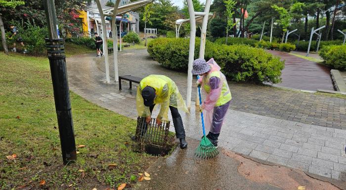![]() 지난 25일 공원녹지관리 작업단이 신대 중앙공원 내 배수로 준설작업을 하고 있다 |