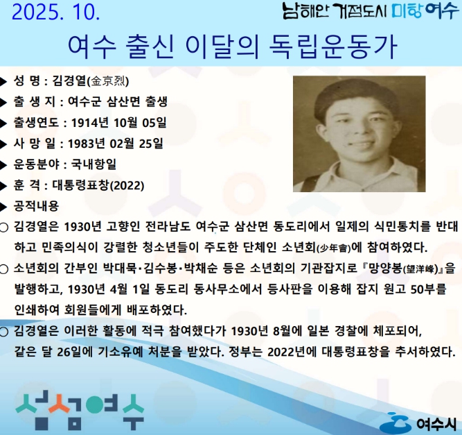 ![]() 여수시 ‘2025년 10월 이달의 독립운동가’ |