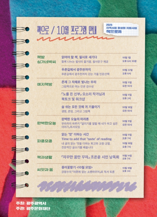 광주문화재단 노희용 대표이사는 “독서의 계절 가을, 일상 속 공간인 서점에서 인문학적 체험계기가 확대되기를 기대한다”며 “많은 시민들의 관심과 참여를 부탁드린다”고 말했다.