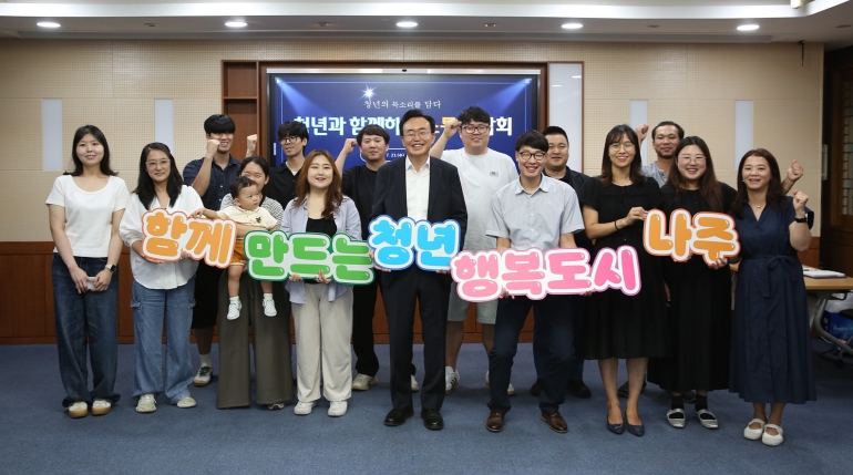 ![]() 윤병태 나주시장이 지난 7월에 개최한 청년소통간담회에 참석한 청년들과 함께 사진 촬영을 했다 |